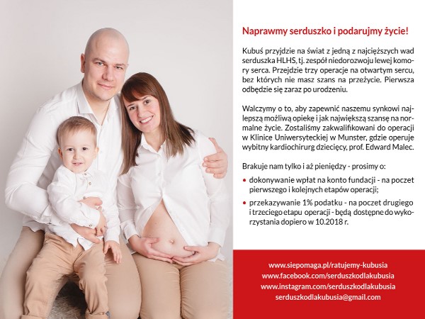 Przed Kubusiem i jego rodzicami jeszcze dwie ważne operacje. W dalszym ciągu ludzie dobrego serca mogą wspomóc proces leczenia chłopca, dołączając do zbiórki pieniędzy na ten cel, m.in. za pośrednictwem Fundacji Siepomaga, na stronie: www.siepomaga.pl/ratujemy-kubusia oraz aukcji na profilu Facebook Serduszko dla Kubusia – Kuba Barszczewicz HLHS: https://www.facebook.com/serduszkodlakubusia/.